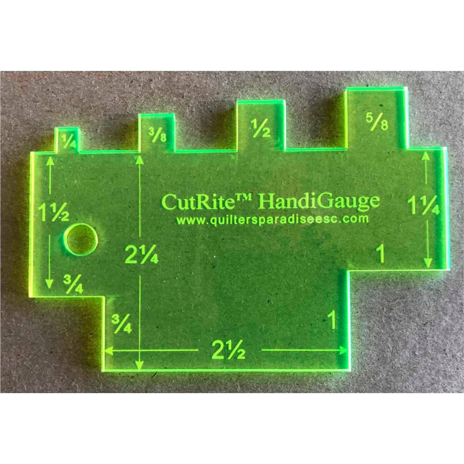 Want a handy, compact template that will quickly measure and check your seam size? It contains 10 common measurements: eight from 1/4" to 1-1/2" plus the two most popular quilt binding sizes, 2-1/4" and 2-1/2"! The fluorescent green color keeps the template from being misplaced or lost and the engraved markings are easy-to-read and won't rub off.